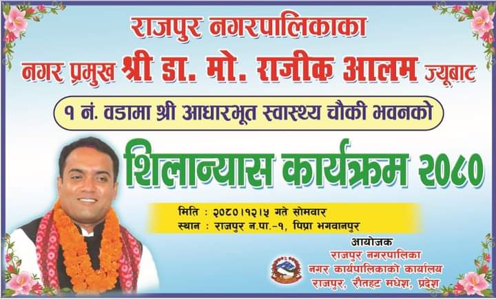 चैत्र ५ । रौतहट जिल्लाको राजपुर नगरपालिकामा आज २ वटा स्वास्थ्य चौकी भवनको शिलान्यास नगर प्रमुख डा.मो.राजीक आलमले गर्नु भएका छन् ।
